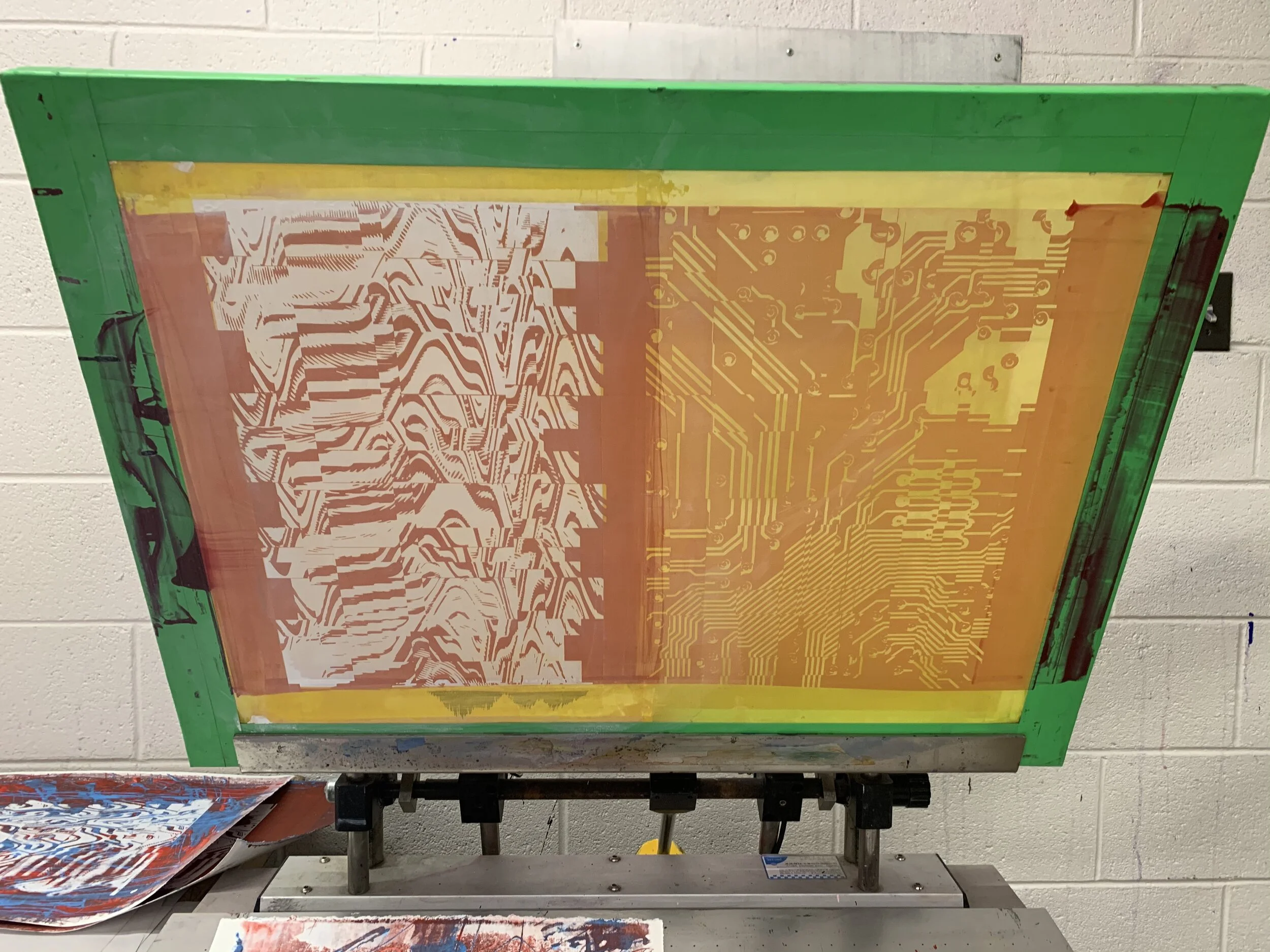 For the first layer, I used bright red and fluorescent blue to create a 3D effect, specifically, anaglyph 3D. Anaglyph 3D is “the stereoscopic 3D effect achieved by means of encoding each eye’s image using filters of different (usually chromatically opposite) colors, typically red and cyan.” In an attempt to create this effect, I splattered ink directly onto the screen (layering red on top of blue), and then flushed the screen using transparency base. The transparency base helped to “lock in” the ink, translating the splattered/glitchy design onto the paper.